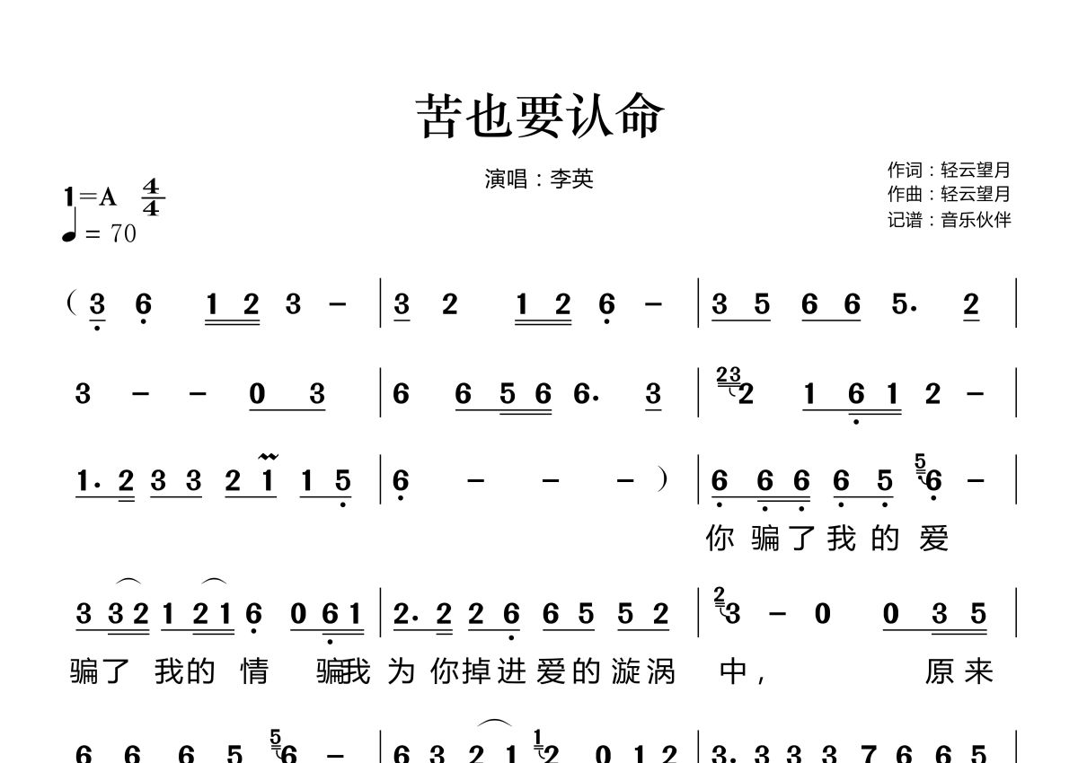 《苦也要认命》是李英演唱的一首歌曲,这份简谱共有两张高清图谱,图谱由 @音乐伙伴 编配上传。