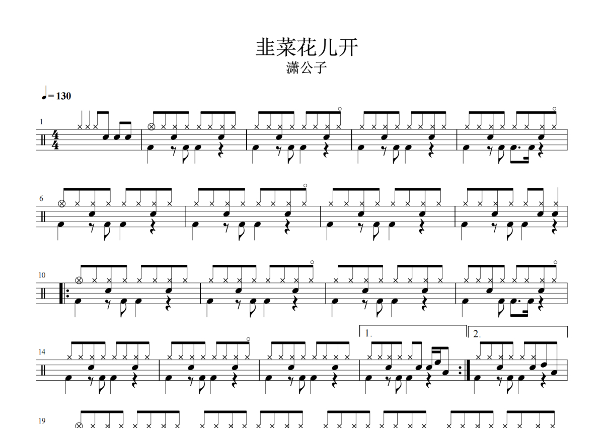 《韭菜花儿开》是潇公子演唱的一首歌曲,拍号为4/4拍,歌曲速度为每分钟130拍,这份架子鼓谱共有两张高清图谱,图谱由 @失眠的土豆 编配上传,图谱使用五线谱编配,使用这份韭菜花儿开架子鼓谱,你将能够轻松地敲打出这首潇公子的韭菜花儿开,快来尝试吧。