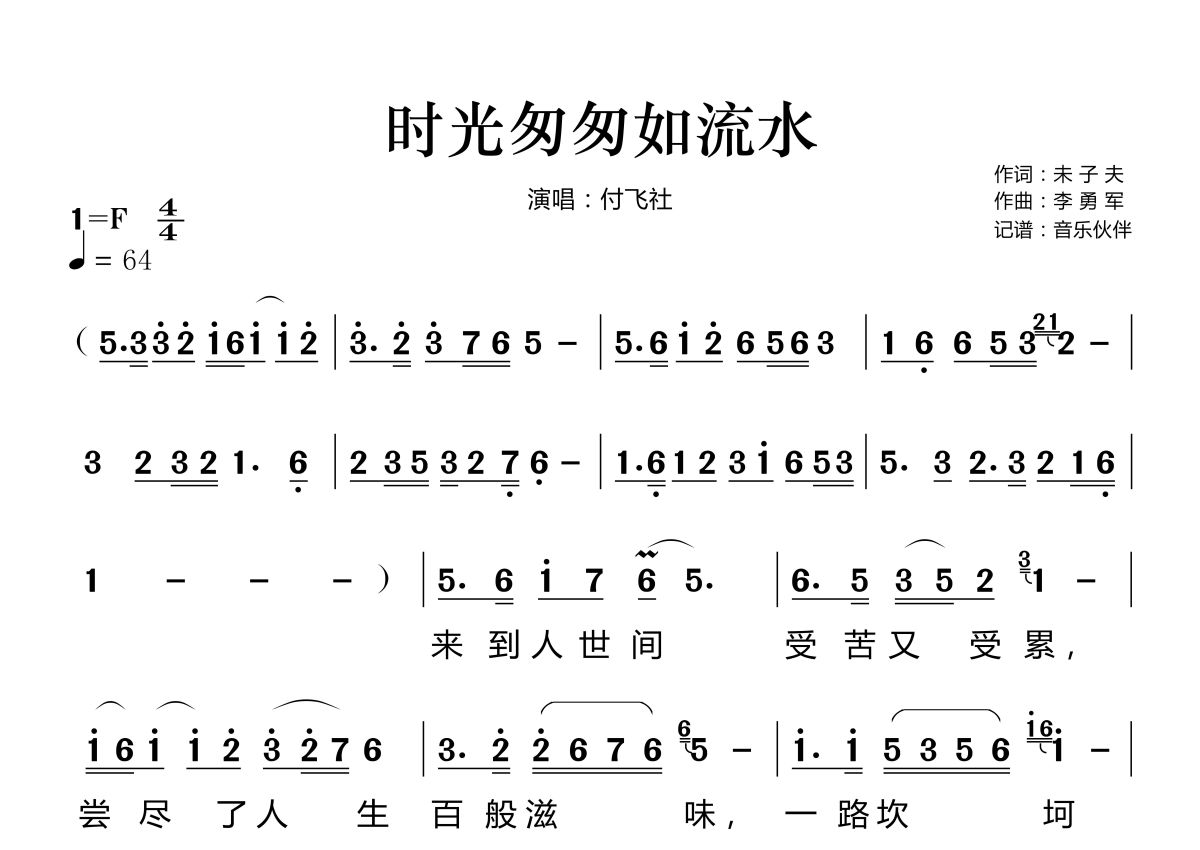 时光匆匆如流水简谱 - 付飞社演唱