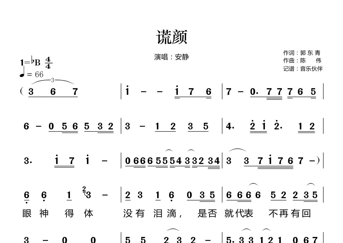 《谎颜》是安静演唱的一首歌曲,这份简谱共有两张高清图谱,图谱由 @音乐伙伴 编配上传。