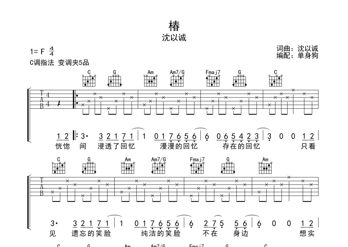 沈以诚《椿》吉他谱 - C调弹唱六线谱