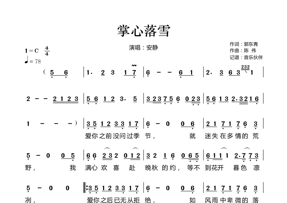 《掌心落雪》是安静演唱的一首歌曲,拍号为4/4拍,歌曲速度为每分钟78拍,这份简谱共有两张高清图谱,图谱由 @音乐伙伴 编配上传。