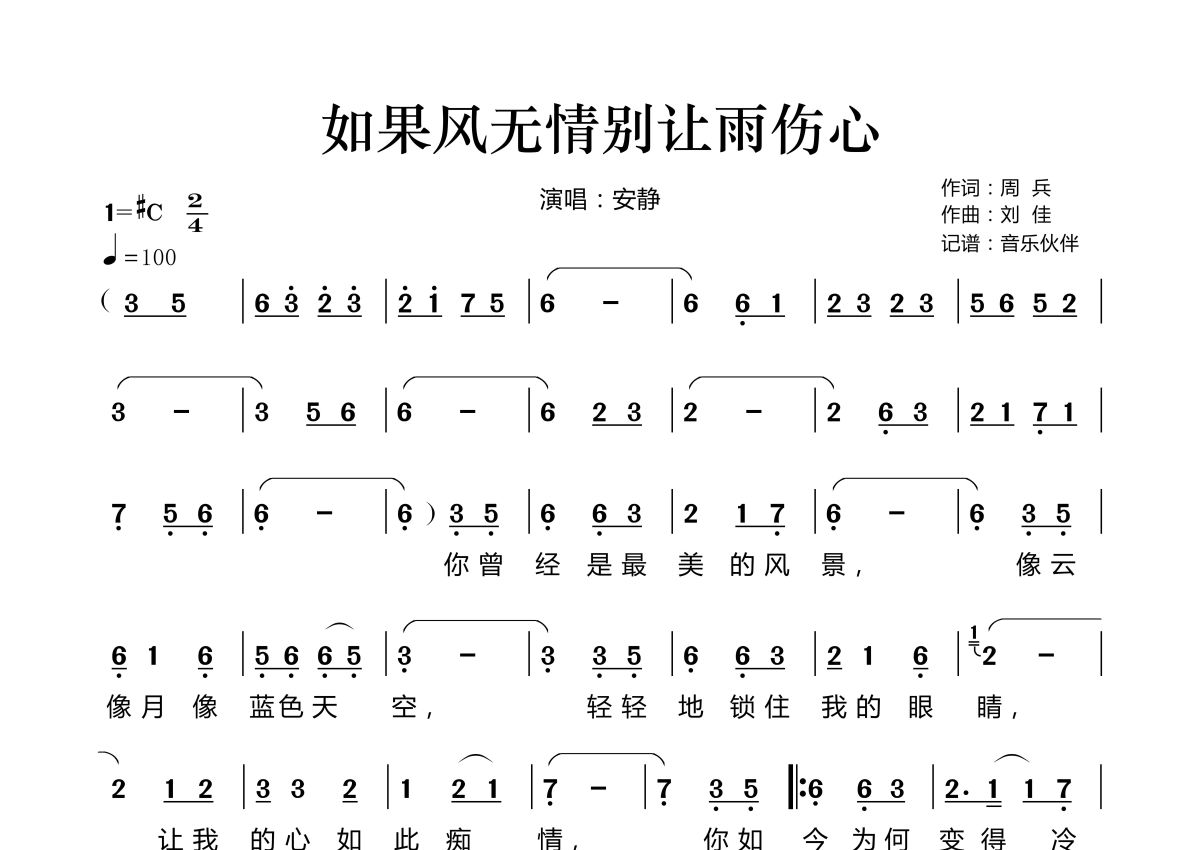 《如果风无情别让雨伤心》是安静演唱的一首歌曲,拍号为2/4拍,歌曲速度为每分钟100拍,这份简谱共有两张高清图谱,图谱由 @音乐伙伴 编配上传。