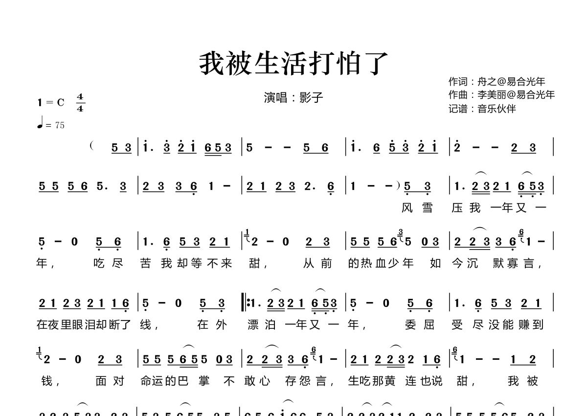 《我被生活打怕了》是影子演唱的一首歌曲,这份简谱共有一张高清图谱,图谱由 @音乐伙伴 编配上传。