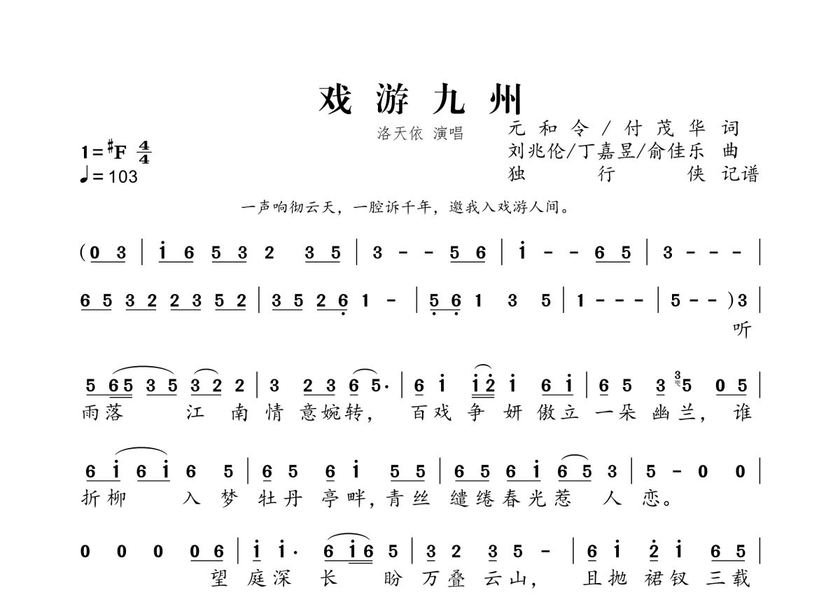 《戏游九州》是洛天依演唱的一首歌曲,拍号为4/4拍,歌曲速度为每分钟103拍,这份简谱共有两张高清图谱,图谱由 @独行侠 编配上传。