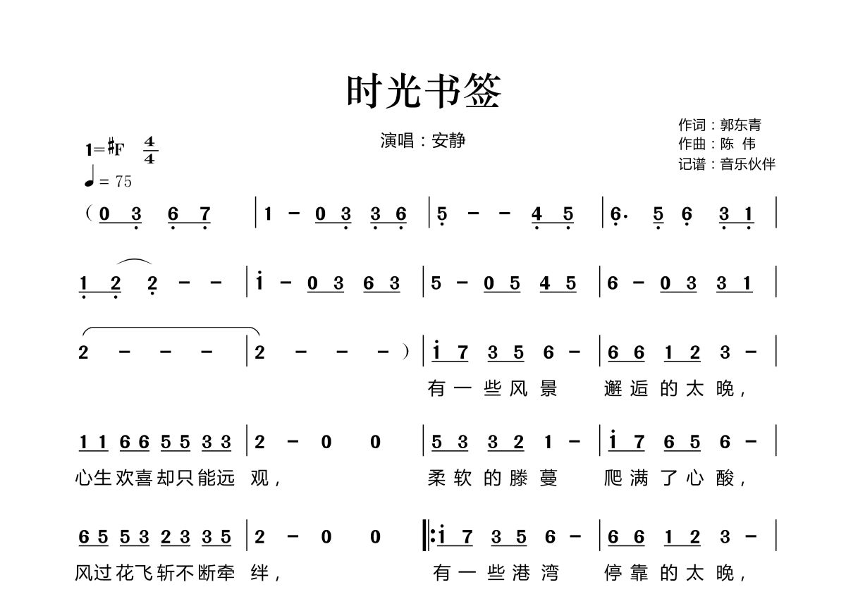 《时光书签》是安静演唱的一首歌曲,拍号为4/4拍,歌曲速度为每分钟75拍,这份简谱共有两张高清图谱,图谱由 @音乐伙伴 编配上传。