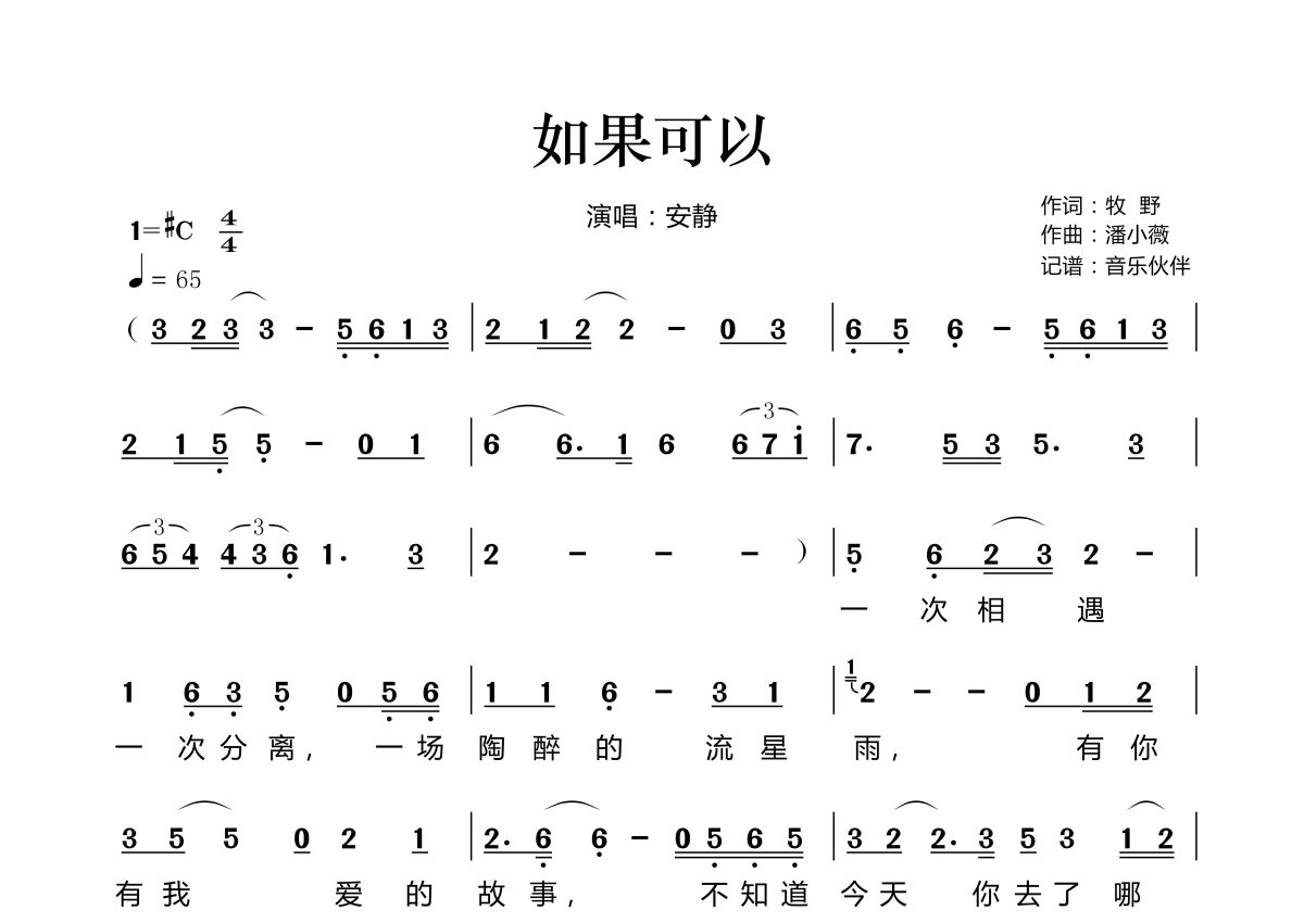 《如果可以》是安静演唱的一首歌曲,拍号为4/4拍,歌曲速度为每分钟65拍,这份简谱共有两张高清图谱,图谱由 @音乐伙伴 编配上传。