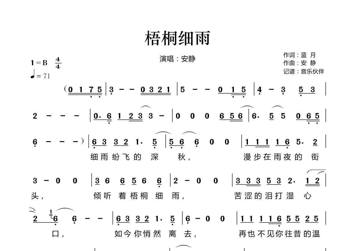 《梧桐细雨》是安静演唱的一首歌曲,拍号为4/4拍,歌曲速度为每分钟71拍,这份简谱共有两张高清图谱,图谱由 @音乐伙伴 编配上传。