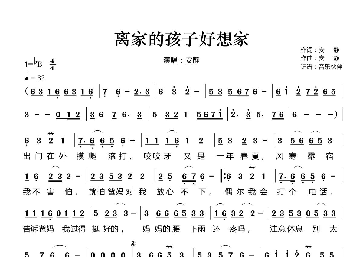 《离家的孩子好想家》是安静演唱的一首歌曲,这份简谱共有一张高清图谱,图谱由 @音乐伙伴 编配上传。