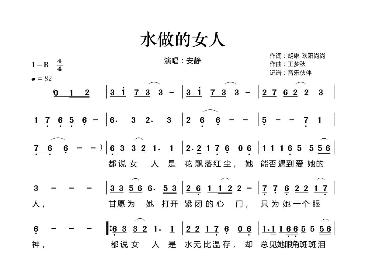 《水做的女人》是安静演唱的一首歌曲,拍号为4/4拍,歌曲速度为每分钟82拍,这份简谱共有两张高清图谱,图谱由 @音乐伙伴 编配上传。