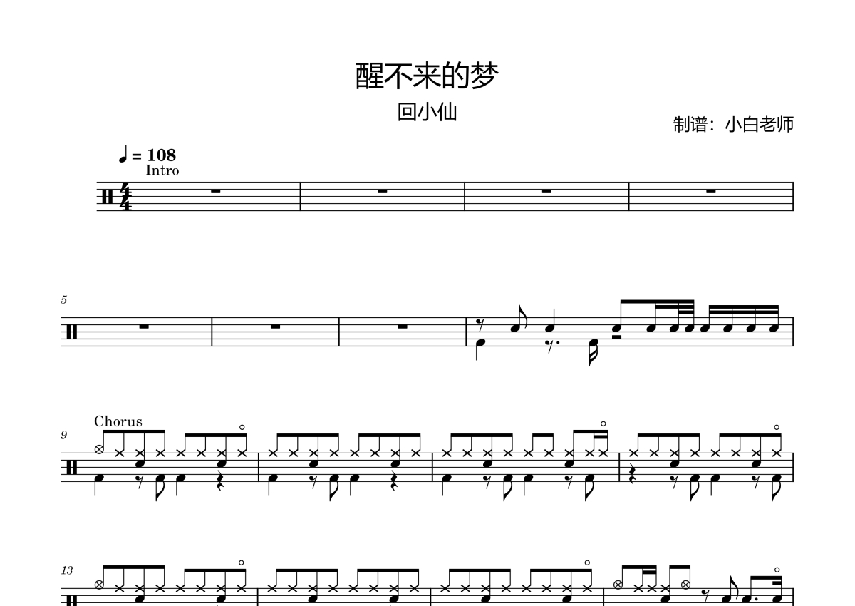 《醒不来的梦》是回小仙演唱的一首歌曲,拍号为4/4拍,歌曲速度为每分钟108拍,这份架子鼓谱共有四张高清图谱,图谱由 @苏小白 编配上传,图谱使用五线谱编配,使用这份醒不来的梦架子鼓谱,你将能够轻松地敲打出这首回小仙的醒不来的梦,快来尝试吧。醒不来的梦。
