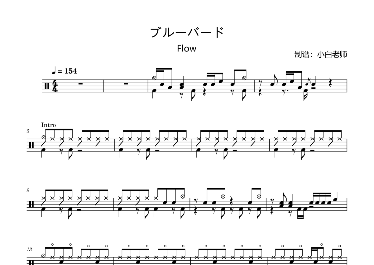 《ブルーバード(青鸟)》是青鸟演唱的一首歌曲,这份架子鼓谱共有五张高清图谱,图谱由 @苏小白 编配上传,图谱使用五线谱编配,使用这份ブルーバード(青鸟)架子鼓谱,你将能够轻松地敲打出这首青鸟的ブルーバード(青鸟),快来尝试吧。ブルーバード(青鸟) 火影忍者。