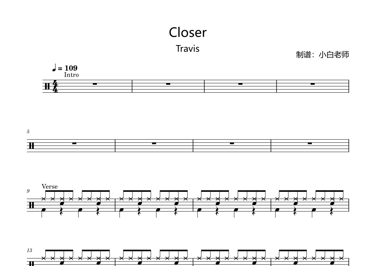 《Closer》是Travis演唱的一首歌曲,这份架子鼓谱共有四张高清图谱,图谱由 @苏小白 编配上传,图谱使用五线谱编配,使用这份Closer架子鼓谱,你将能够轻松地敲打出这首Travis的Closer,快来尝试吧。Closer。
