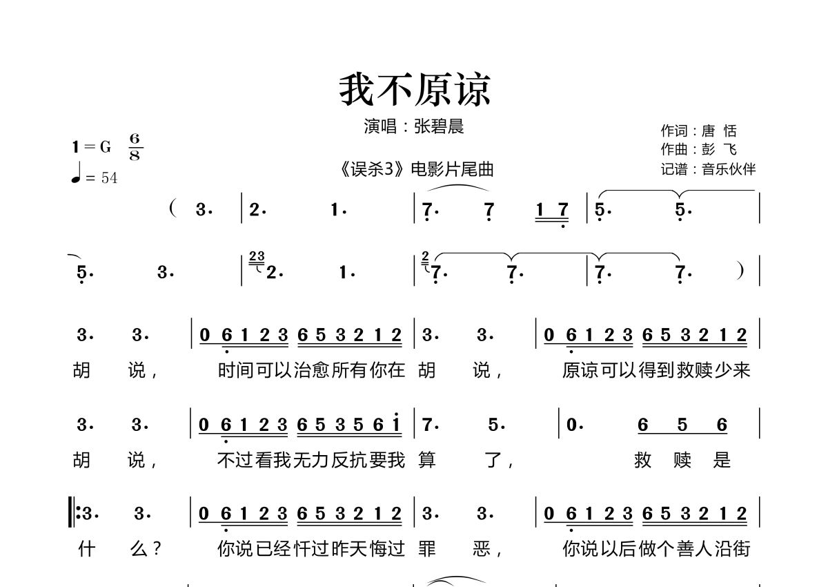 《我不原谅》是张碧晨演唱的一首歌曲,拍号为6/8拍,歌曲速度为每分钟54拍,这份简谱共有两张高清图谱,图谱由 @音乐伙伴 编配上传《误杀3》电影片尾曲。