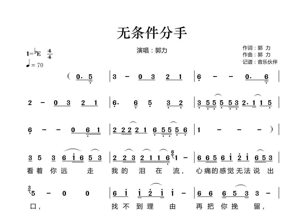 《无条件分手》是郭力演唱的一首歌曲,拍号为4/4拍,歌曲速度为每分钟70拍,这份简谱共有两张高清图谱,图谱由 @音乐伙伴 编配上传。