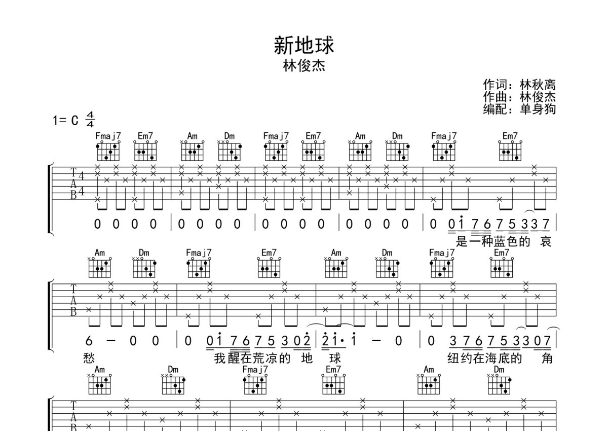 林俊杰《新地球》吉他谱 - C调弹唱六线谱