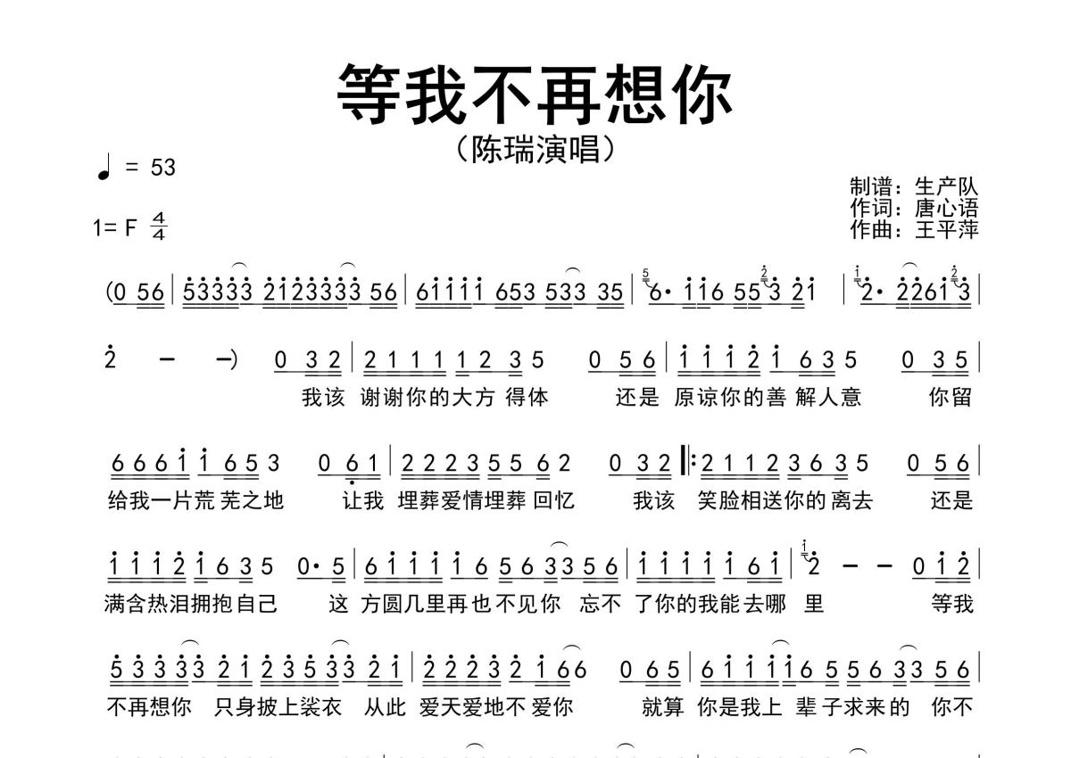 《等我不再想你》是陈瑞演唱的一首歌曲,原版简谱,拍号为4/4拍,歌曲速度为每分钟53拍,这份简谱共有一张高清图谱,图谱由 @生产队 编配上传陈瑞演唱的歌曲《等我不再想你》原版简谱,完整的前奏、间奏solo编配。