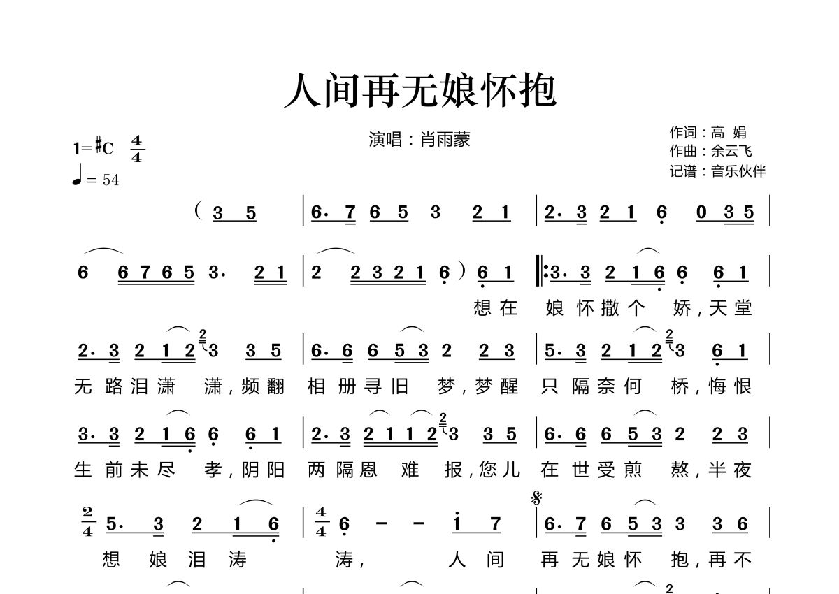《人间再无娘怀抱》是肖雨蒙演唱的一首歌曲,拍号为4/4拍,歌曲速度为每分钟54拍,这份简谱共有一张高清图谱,图谱由 @音乐伙伴 编配上传。