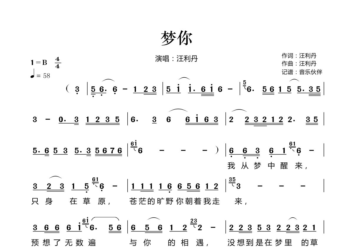 《梦你》是汪利丹演唱的一首歌曲,拍号为4/4拍,歌曲速度为每分钟58拍,这份简谱共有两张高清图谱,图谱由 @音乐伙伴 编配上传。
