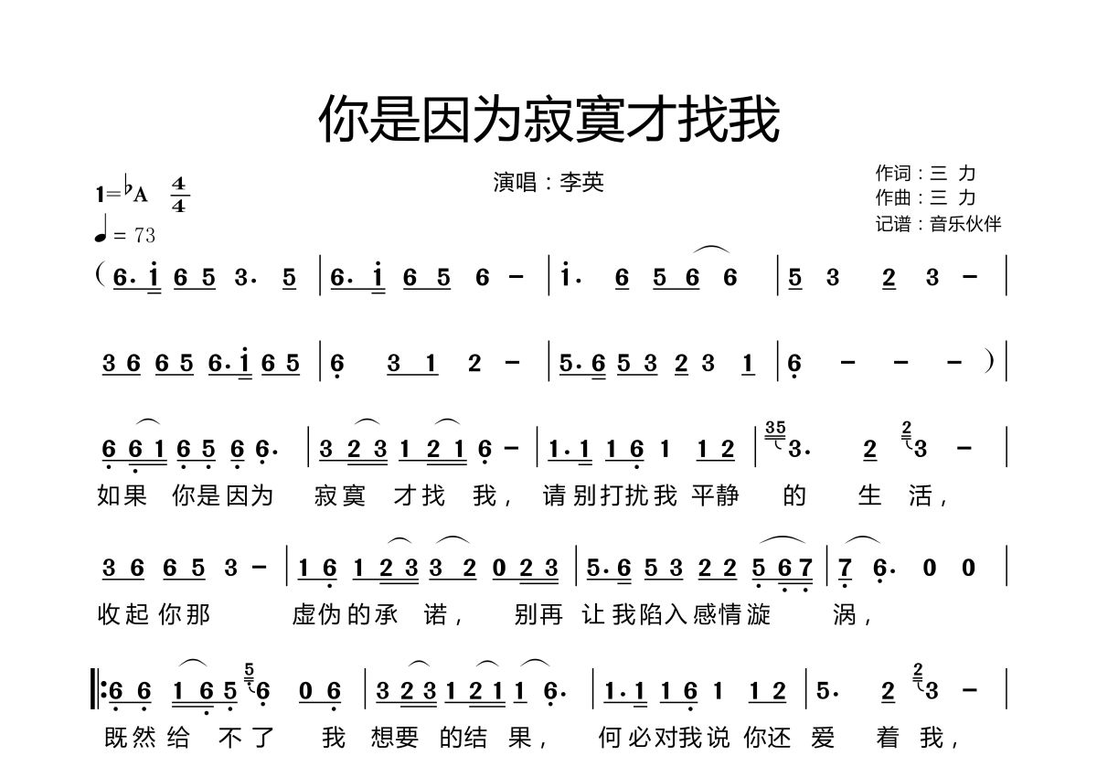 《你是因为寂寞才找我》是李英演唱的一首歌曲,拍号为4/4拍,歌曲速度为每分钟73拍,这份简谱共有两张高清图谱,图谱由 @音乐伙伴 编配上传。