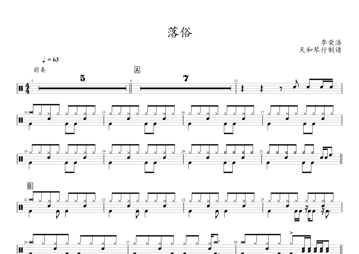 《落俗》是李荣浩演唱的一首歌曲,拍号为4/4拍,歌曲速度为每分钟63拍,这份架子鼓谱共有两张高清图谱,图谱由 @音符喷血者 编配上传,图谱使用五线谱编配,使用这份落俗架子鼓谱,你将能够轻松地敲打出这首李荣浩的落俗,快来尝试吧。