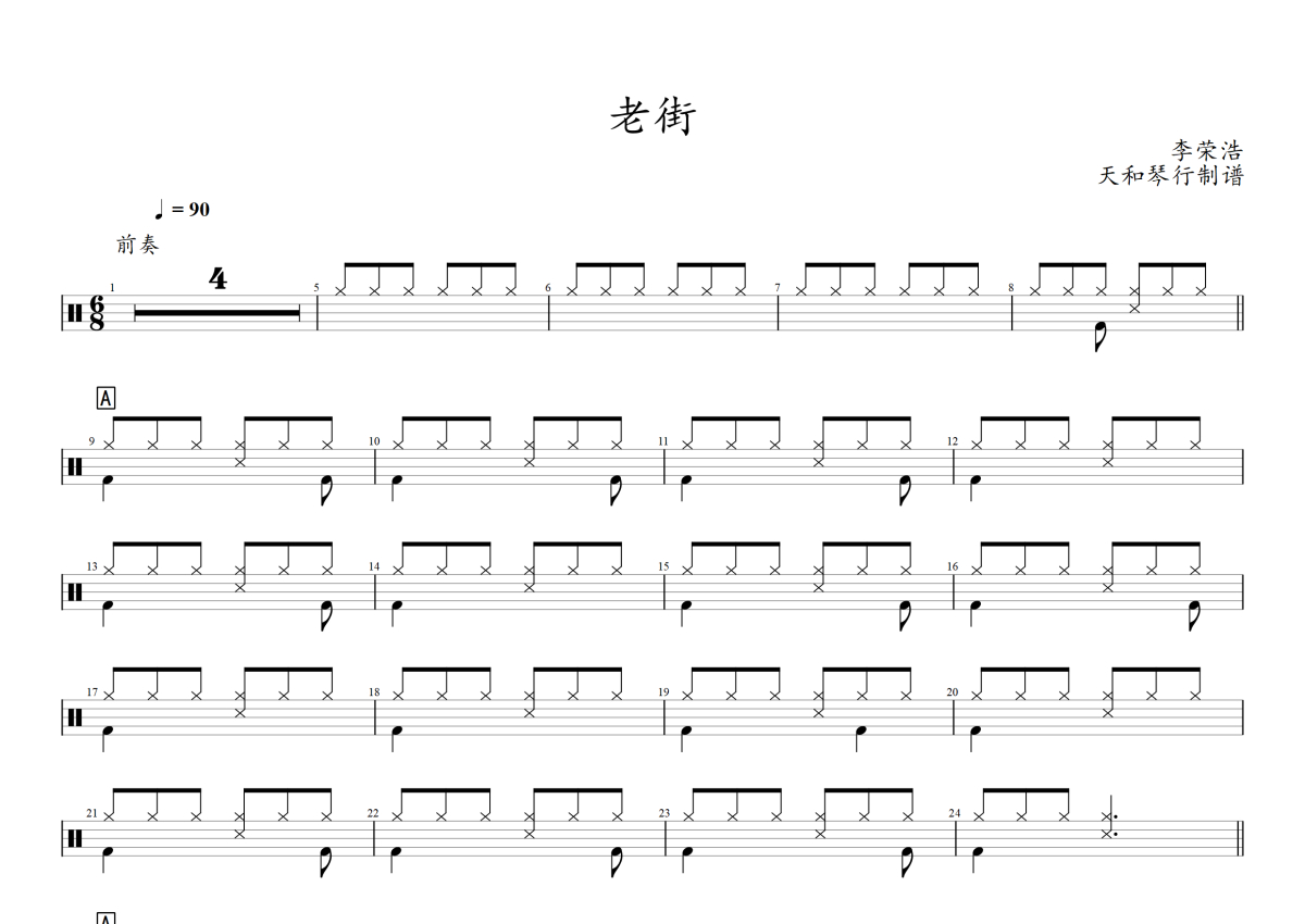 《老街》架子鼓谱 - 李荣浩