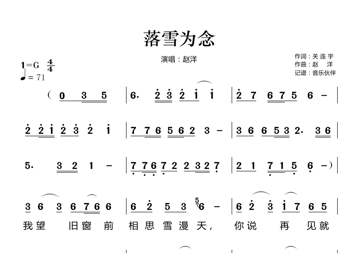 落雪为念简谱 - 赵洋演唱