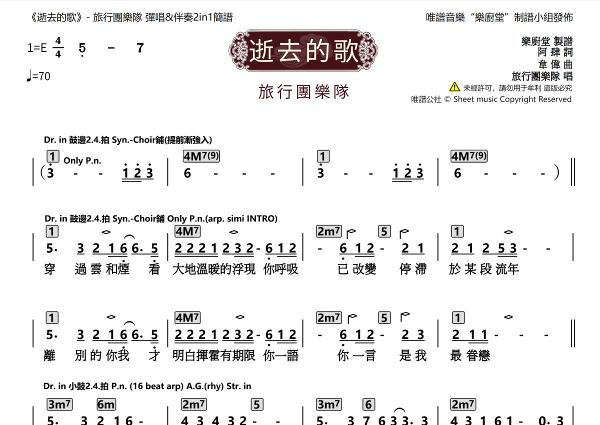 《逝去的歌》是旅行团乐队演唱的一首歌曲,这份乐队总谱共有三张高清图谱,图谱由 @唯谱音乐"乐厨堂"发布小组 编配上传。
