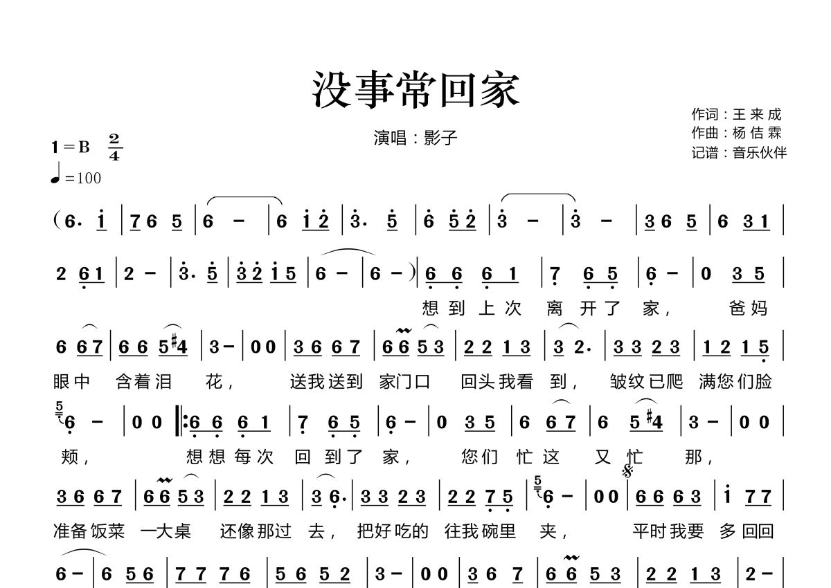 没事常回家简谱 - 影子演唱