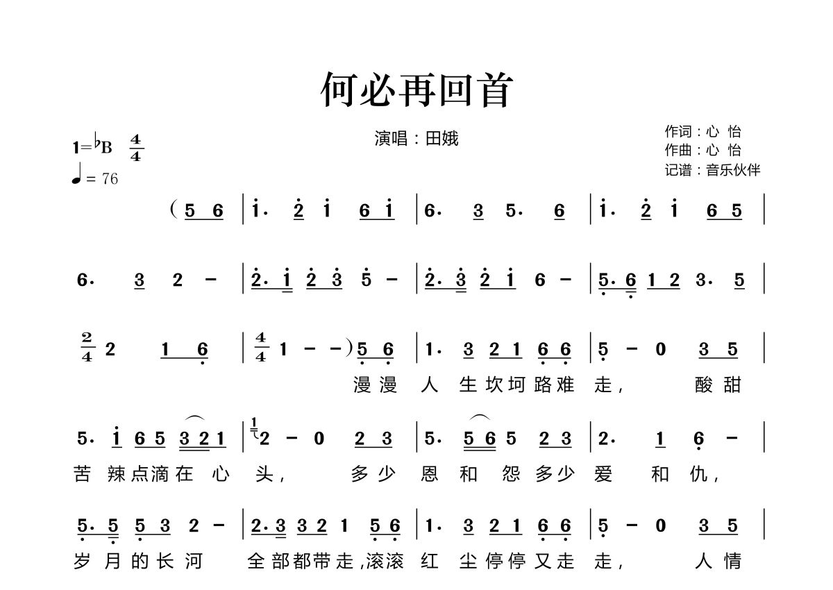 《何必再回首》是田娥演唱的一首歌曲,拍号为4/4拍,歌曲速度为每分钟76拍,这份简谱共有两张高清图谱,图谱由 @音乐伙伴 编配上传。