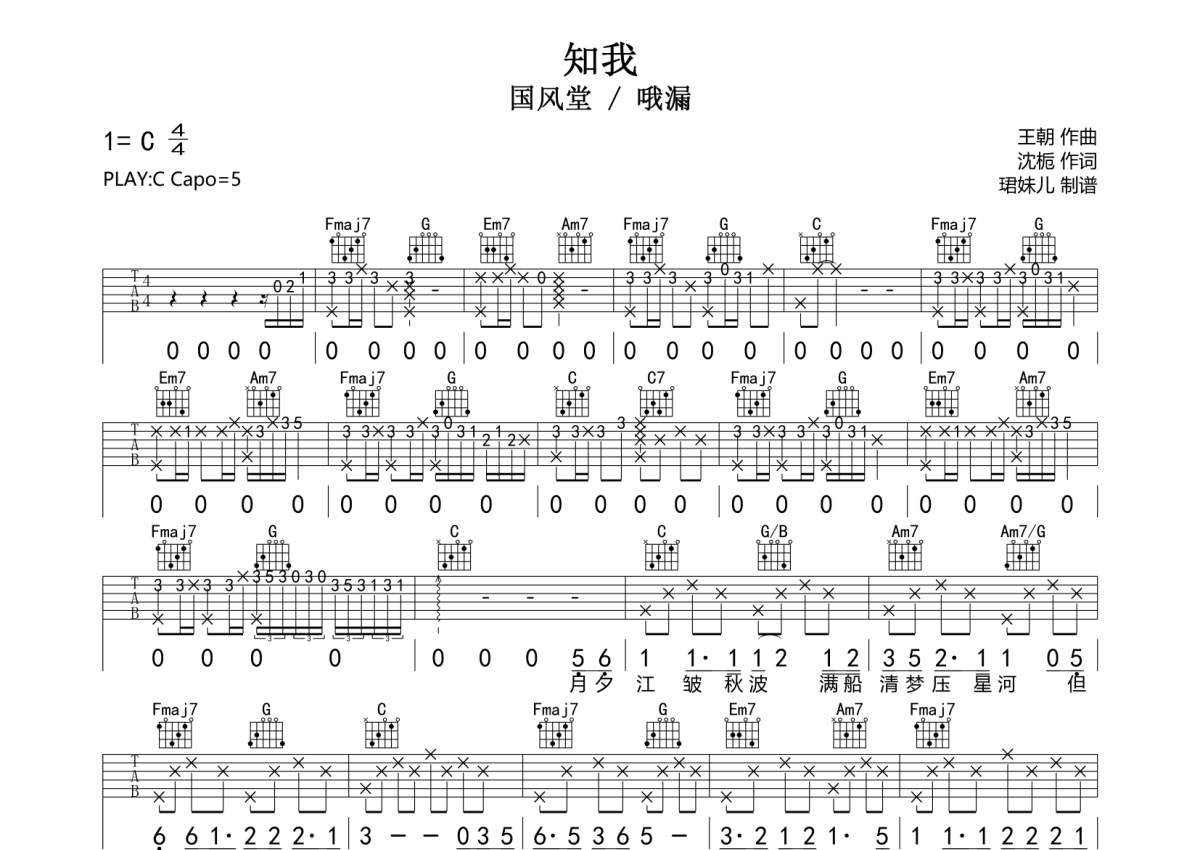 国风堂 / 哦漏《知我》吉他谱 - C调弹唱六线谱