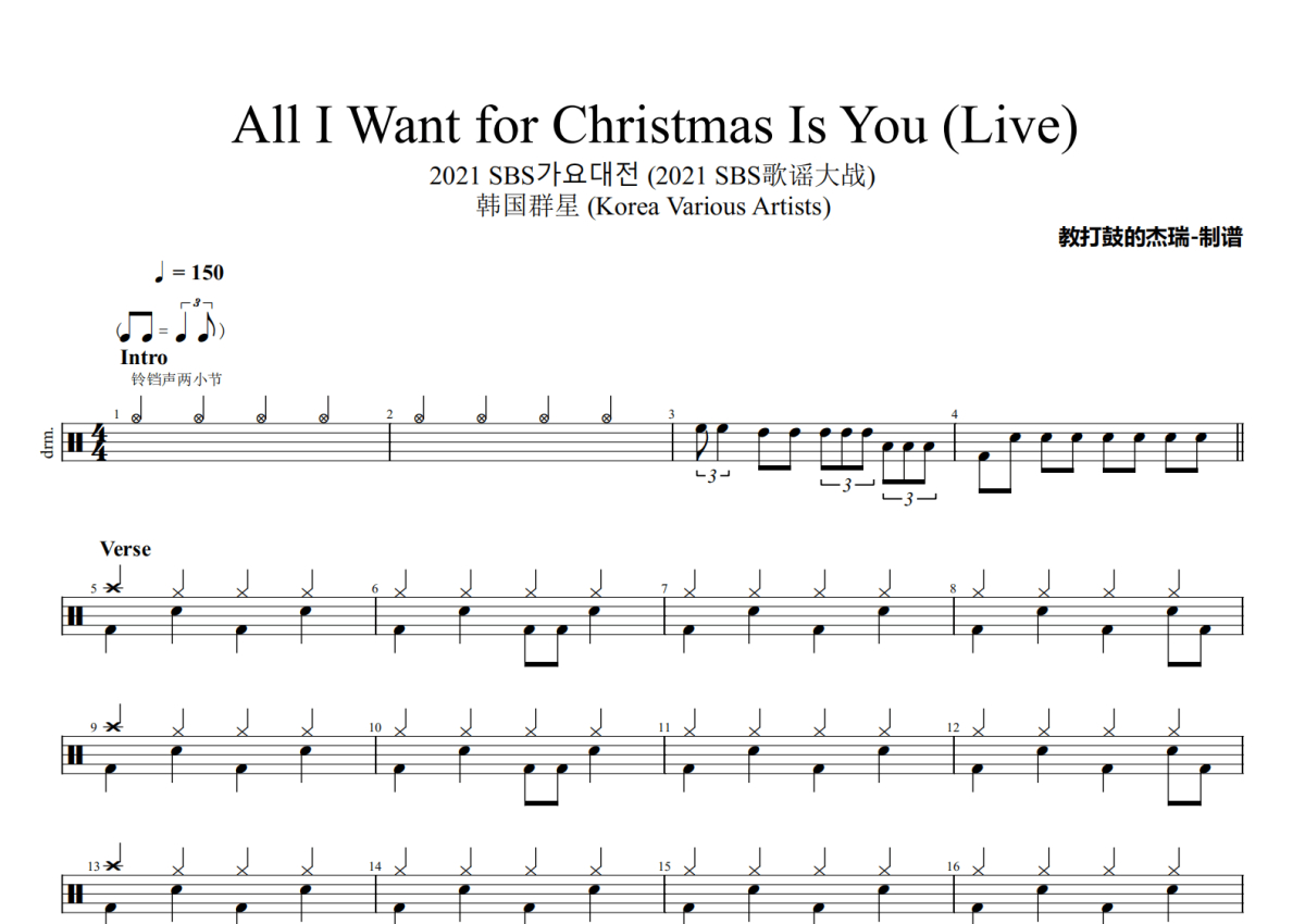 《All I Want for Christmas Is You (Live)》是韩国群星 (Korea Various Artists)演唱的一首歌曲,2021 SBS가요대전 (2021 SBS歌谣大战),这份架子鼓谱共有三张高清图谱,图谱由 @Jerry 编配上传,图谱使用五线谱编配,使用这份All I Want for Christmas Is You (Live)架子鼓谱,你将能够轻松地敲打出这首韩国群星 (Korea Various Artists)的All I Want for Christmas Is You (Live),快来尝试吧。