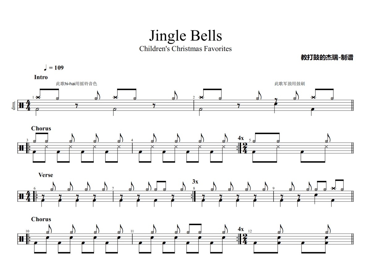 《Jingle Bells》是Children's Christmas Favorites演唱的一首歌曲,拍号为4/4拍,歌曲速度为每分钟109拍,这份架子鼓谱共有两张高清图谱,图谱由 @Jerry 编配上传,图谱使用五线谱编配,使用这份Jingle Bells架子鼓谱,你将能够轻松地敲打出这首Children's Christmas Favorites的Jingle Bells,快来尝试吧。