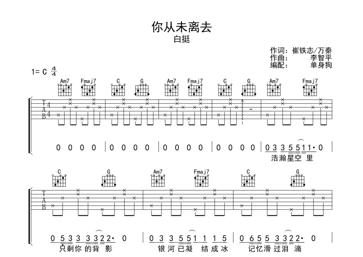 白挺《你从未离去》吉他谱 - C调弹唱六线谱