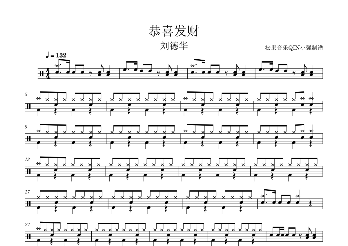 《恭喜发财》是刘德华演唱的一首歌曲,这份架子鼓谱共有三张高清图谱,图谱由 @松果音乐QIN小强 编配上传,图谱使用五线谱编配,使用这份恭喜发财架子鼓谱,你将能够轻松地敲打出这首刘德华的恭喜发财,快来尝试吧。《恭喜发财》是刘德华演唱的贺年歌曲,由刘德华、李安修作词,陈德建作曲,伍卓贤编曲。 于2005年1月发行,收录于2005年12月13日发行的新曲+精选辑《继续谈情》中。