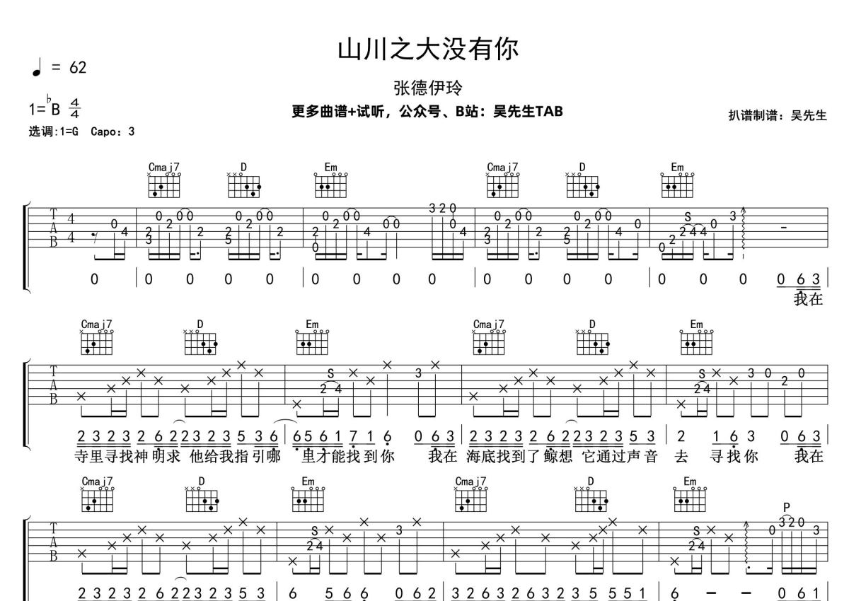 《山川之大没有你》是张德伊玲演唱的一首歌曲,拍号为4/4拍,歌曲速度为每分钟62拍,歌曲原调为Bb调,但由于原调指法比较难,为了方便弹奏,本吉他谱采用的是G调指法编配,变调夹3品弹奏即为原调,当然也可以根据自己的音域改变变调夹位置,或者通过改变和弦调性,以方便自己弹奏,这份吉他谱共有两张高清图谱,图谱由 @吴先生TAB 编配上传,图谱使用六线谱编配,包含吉他和弦指法、简谱以及歌词部分,曲谱配备了相关的音频提供试听,使用这份山川之大没有你吉他谱,可以让你更加方便地掌握这首歌曲的弹唱技巧,快来尝试吧。