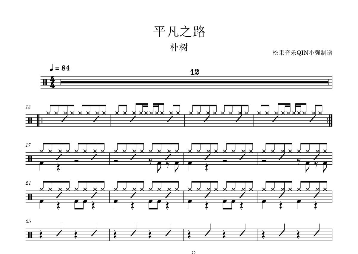 《平凡之路》是朴树演唱的一首歌曲,拍号为4/4拍,这份架子鼓谱共有两张高清图谱,图谱由 @松果音乐QIN小强 编配上传,图谱使用五线谱编配,使用这份平凡之路架子鼓谱,你将能够轻松地敲打出这首朴树的平凡之路,快来尝试吧。《平凡之路》是朴树作曲,朴树、韩寒作词,朴树编曲并演唱的歌曲,单曲于2014年7月16日首发。该歌曲是电影《后会无期》的主题曲,收录于朴树2017年4月30日发行的专辑《猎户星座》中。