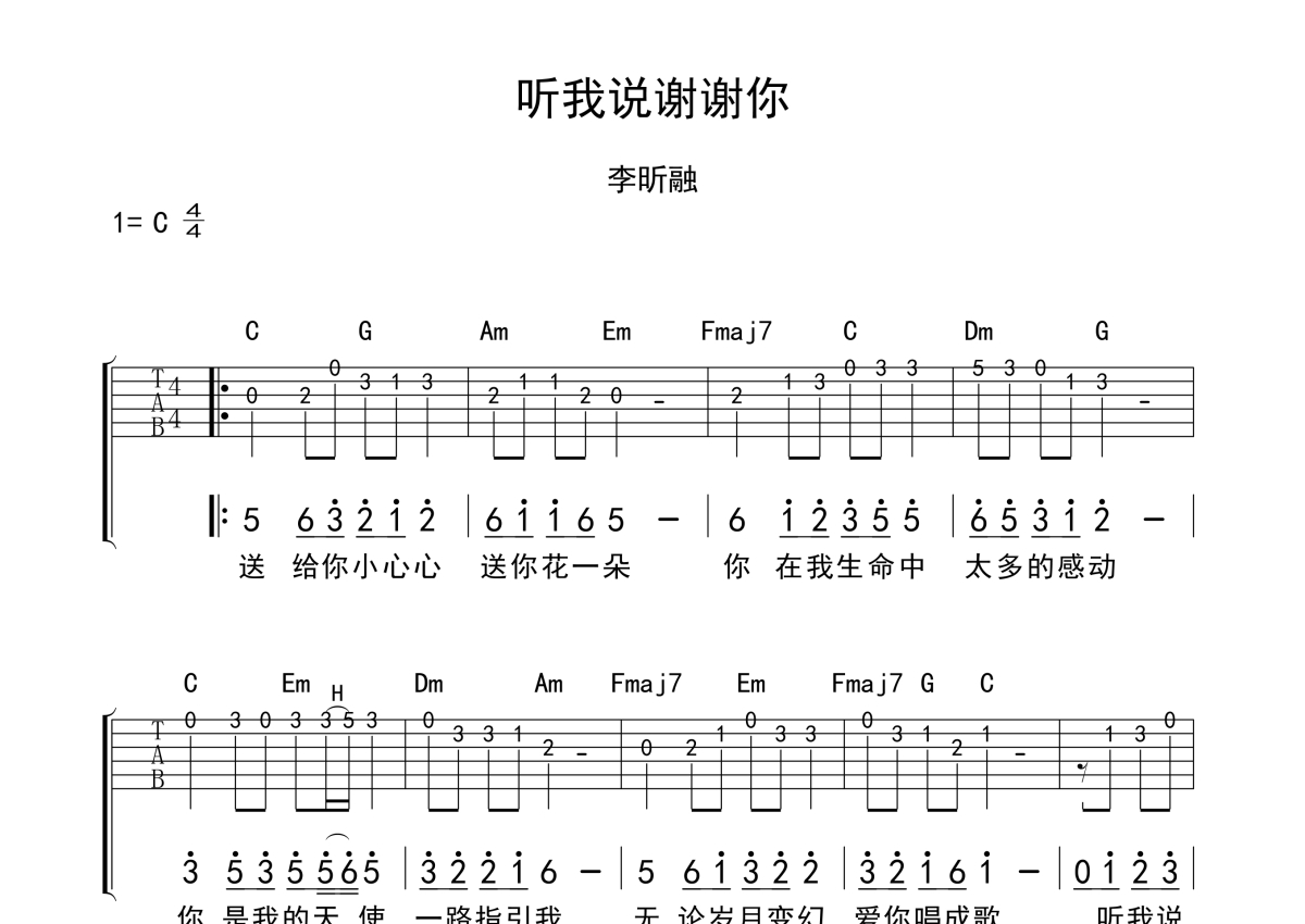 听我说谢谢你吉他谱 - 李昕融演唱 - C调独奏solo六线谱