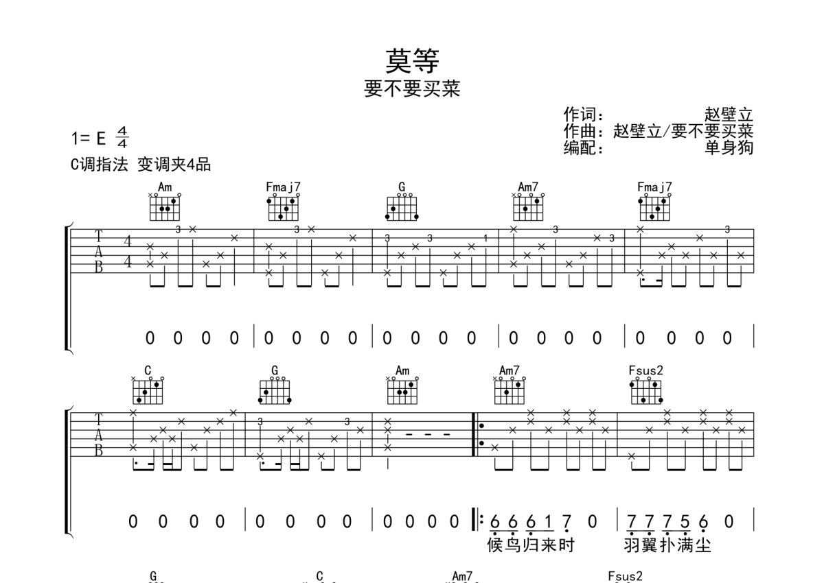 《莫等》是要不要买菜演唱的一首歌曲,本吉他谱采用的是C调指法编配,这份吉他谱共有两张高清图谱,图谱由 @单身狗 编配上传,图谱使用六线谱编配,包含吉他和弦指法、简谱以及歌词部分,使用这份莫等吉他谱,可以让你更加方便地掌握这首歌曲的弹唱技巧,快来尝试吧。要不要买菜《莫等》吉他弹唱谱,采用C调指法编配,单身狗编配出品,共有2张高清图谱,免翻页排版设计。