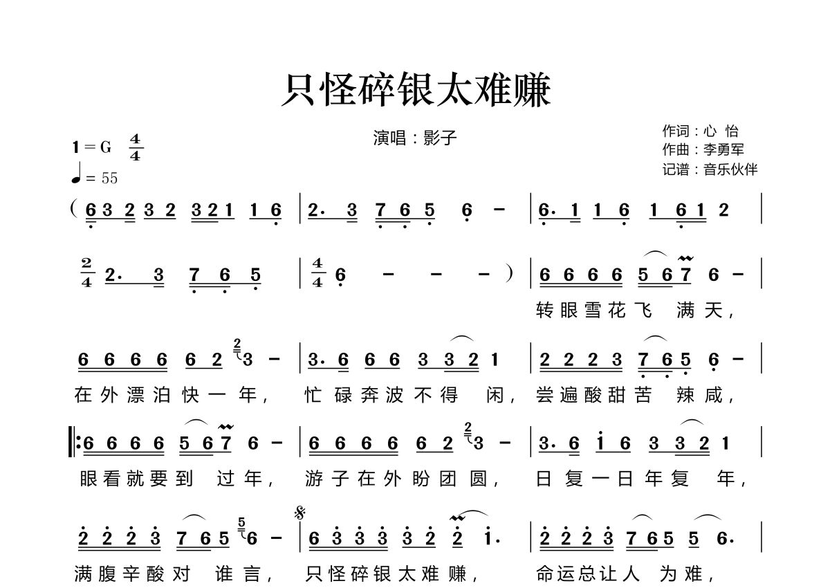 《只怪碎银太难赚》是影子演唱的一首歌曲,拍号为4/4拍,歌曲速度为每分钟55拍,这份简谱共有一张高清图谱,图谱由 @音乐伙伴 编配上传。