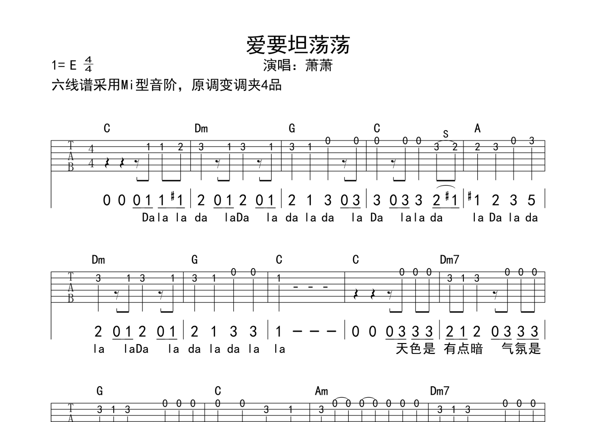 爱要坦荡荡吉他谱 - 萧萧演唱 - C调独奏solo六线谱