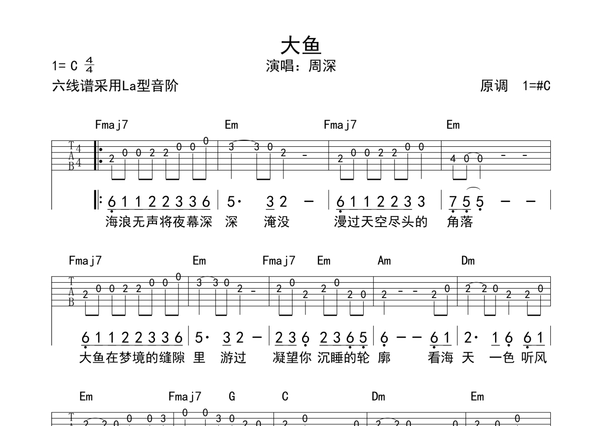 《大鱼》是周深演唱的一首歌曲,拍号为4/4拍,歌曲原调为C调,本吉他谱采用的是G调指法编配,这份吉他谱共有一张高清图谱,图谱由 @觅火单音谱 编配上传,图谱使用六线谱编配,使用这份大鱼吉他谱,可以让你更加方便地掌握这首歌曲的演奏技巧,快来尝试吧。