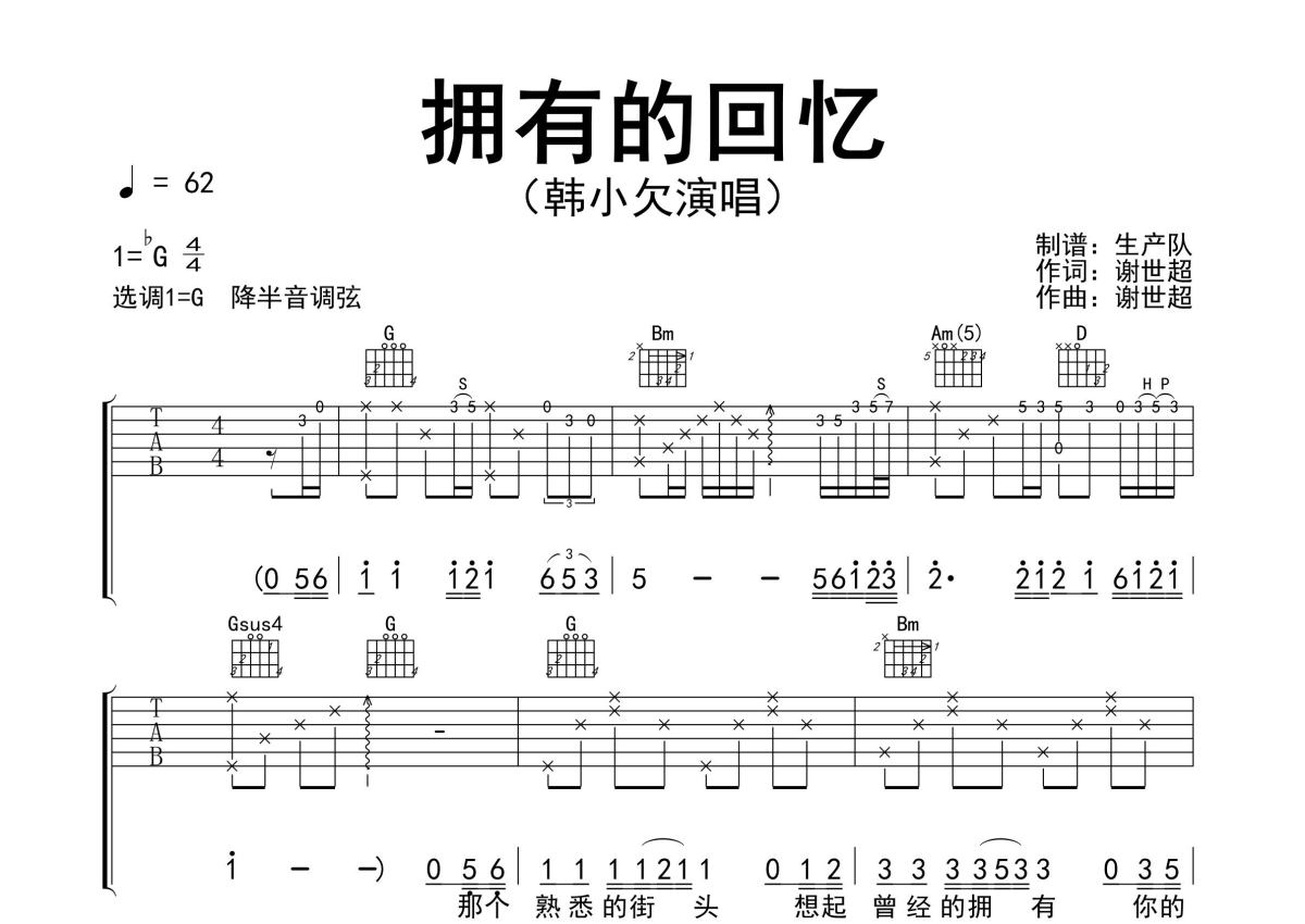 《拥有的回忆》是韩小欠演唱的一首歌曲,精编完美版,拍号为4/4拍,歌曲速度为每分钟62拍,歌曲原调为Gb调,但由于原调指法比较难,为了方便弹奏,本吉他谱采用的是G调指法编配,降半音调弦弹奏即为原调,当然也可以根据自己的音域决定是否调弦,这份吉他谱共有三张高清图谱,图谱由 @生产队 编配上传,图谱使用六线谱编配,包含吉他和弦指法、简谱以及歌词部分,使用这份拥有的回忆吉他谱,可以让你更加方便地掌握这首歌曲的弹唱技巧,快来尝试吧。韩小欠演唱的歌曲《拥有的回忆》原版吉他谱,完整的前奏、间奏、尾奏solo编配,精编完美版,值得推荐!。
