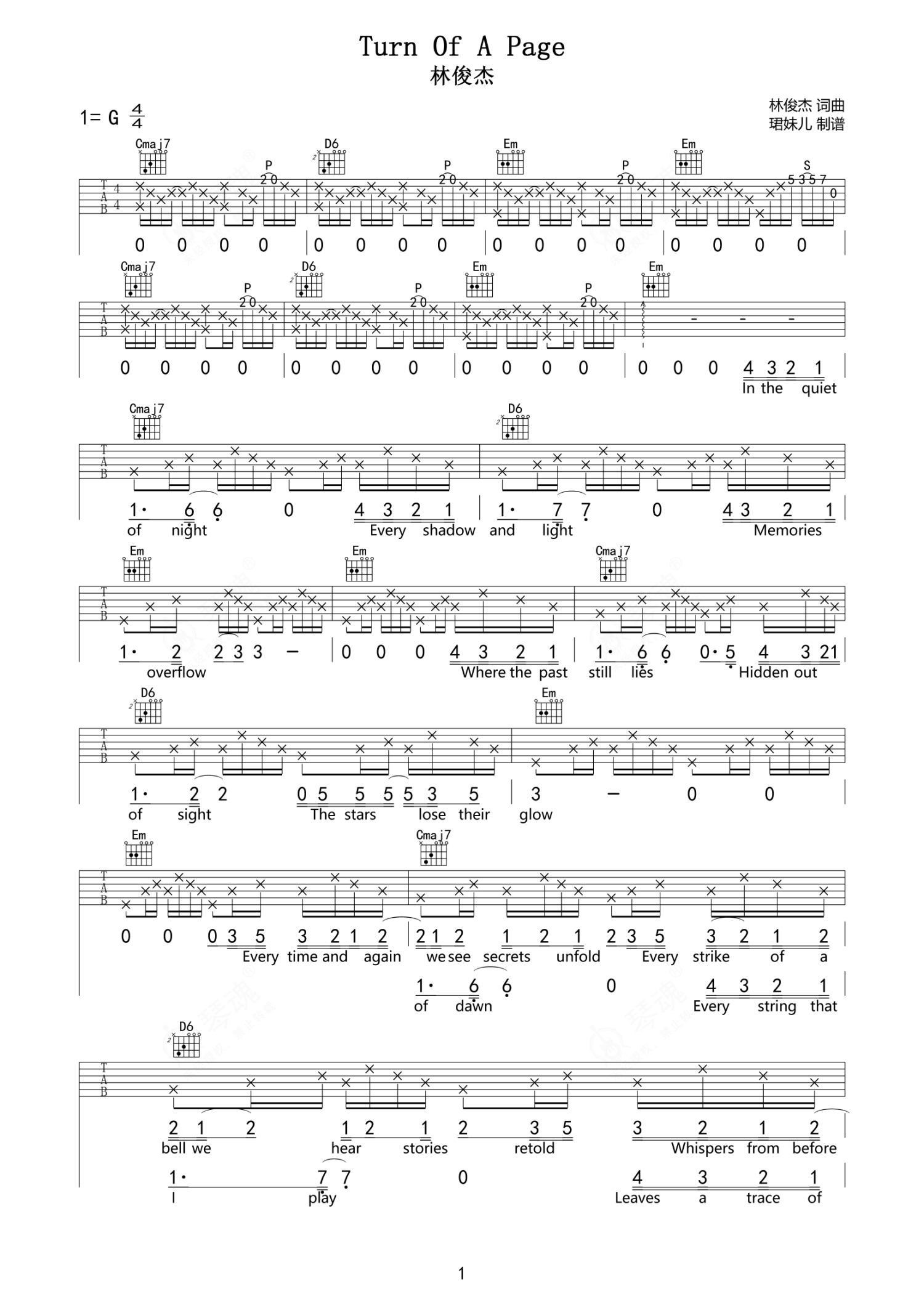 《Turn Of A Page》是林俊杰演唱的一首歌曲,拍号为4/4拍,歌曲速度为每分钟85拍,歌曲原调为G调,本吉他谱采用的是G调指法编配,演奏时不需要使用变调夹即为原调,这份吉他谱共有三张高清图谱,图谱由 @珺妹儿 编配上传,图谱使用六线谱编配,包含吉他和弦指法、简谱以及歌词部分,使用这份Turn Of A Page吉他谱,可以让你更加方便地掌握这首歌曲的弹唱技巧,快来尝试吧。