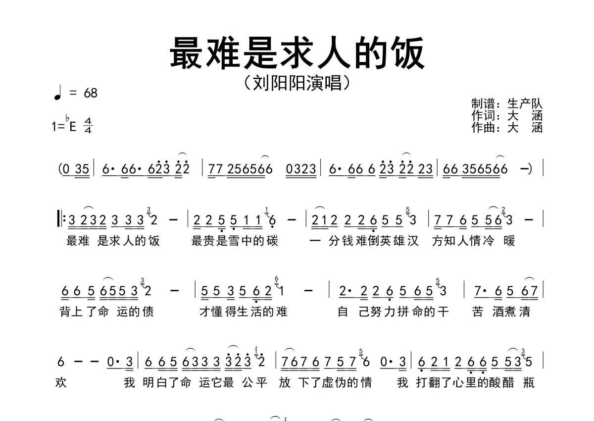 《最难是求人的饭》是刘阳阳演唱的一首歌曲,原版简谱,拍号为4/4拍,歌曲速度为每分钟68拍,这份简谱共有一张高清图谱,图谱由 @生产队 编配上传刘阳阳演唱的歌曲《最难是求人的饭》原版简谱,完整的前奏、间奏、尾奏solo编配。