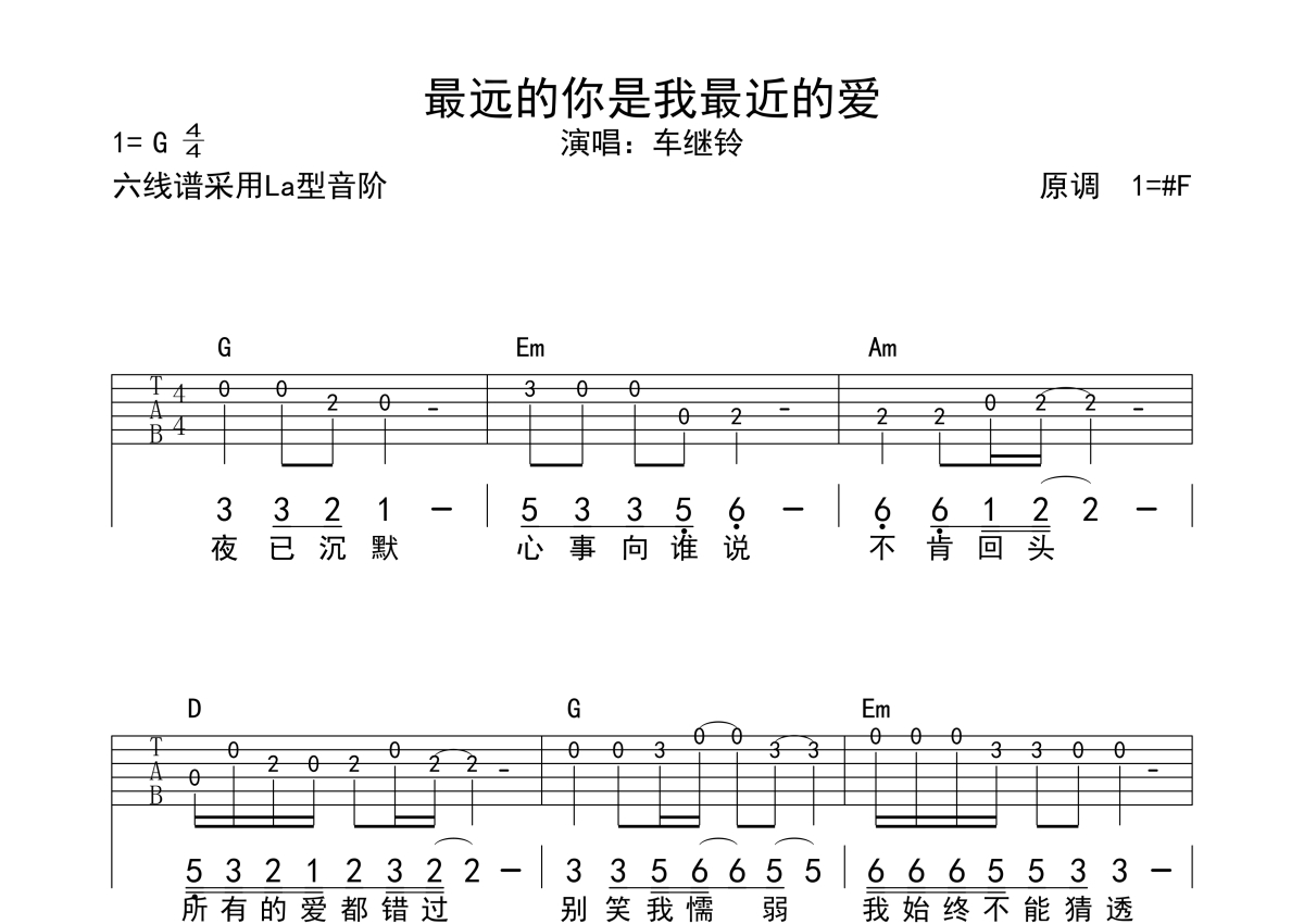 最远的你是我最近的爱吉他谱 - 车继铃演唱 - G调独奏solo六线谱