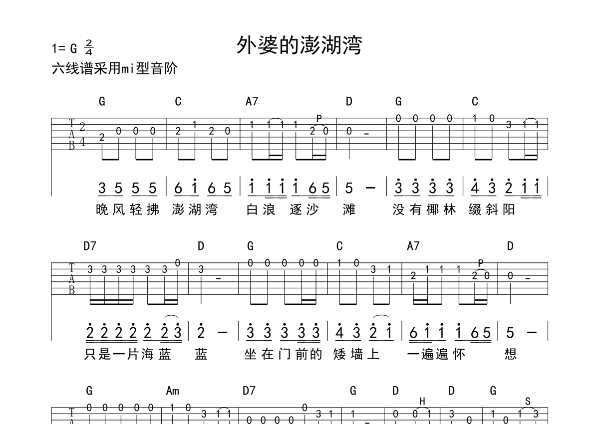 《外婆的澎湖湾》是经典演唱的一首歌曲,拍号为2/4拍,歌曲原调为G调,本吉他谱采用的是C调指法编配,这份吉他谱共有一张高清图谱,图谱由 @觅火单音谱 编配上传,图谱使用六线谱编配,使用这份外婆的澎湖湾吉他谱,可以让你更加方便地掌握这首歌曲的演奏技巧,快来尝试吧。