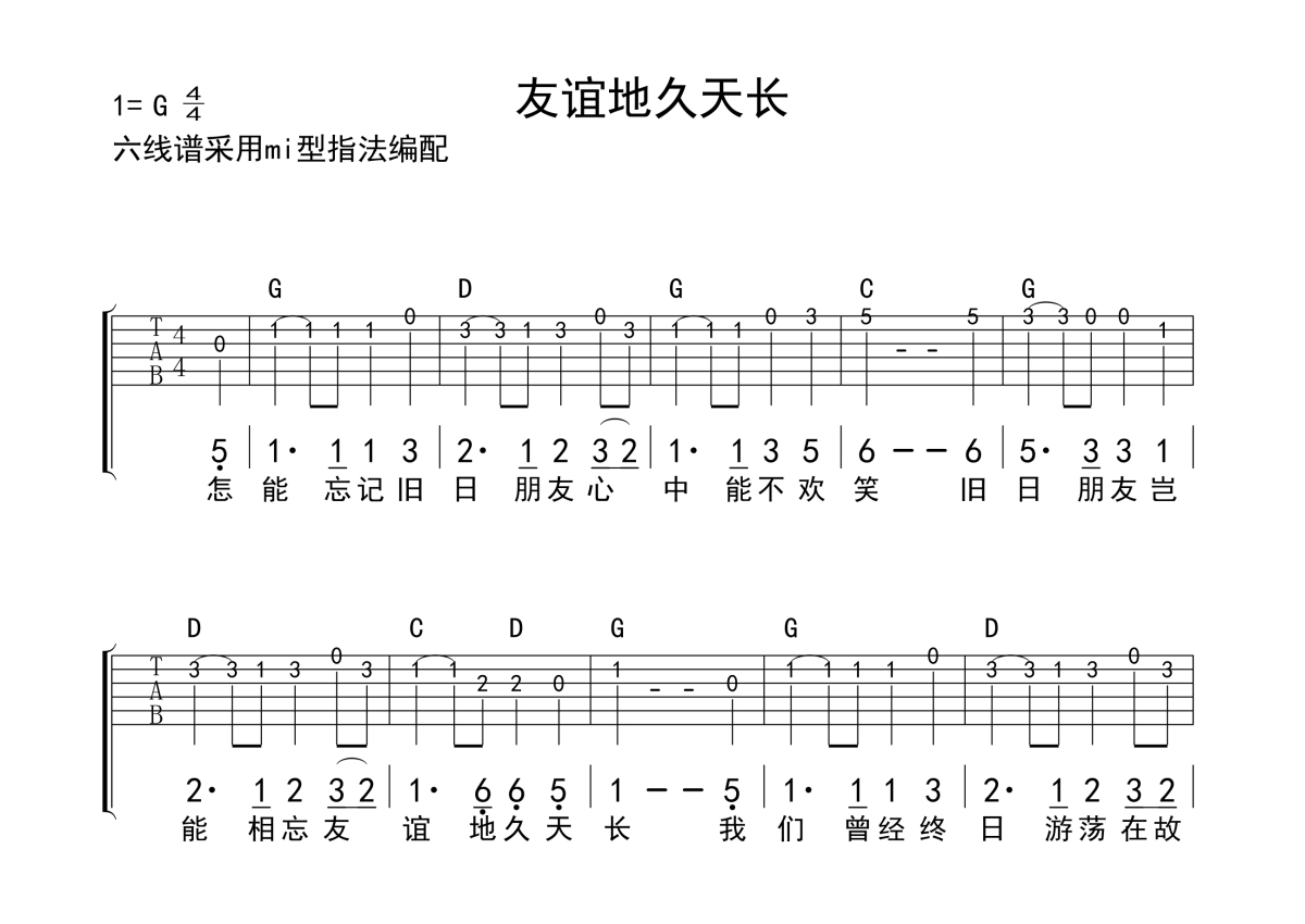 友谊地久天长吉他谱 - 经典民谣演唱 - C调独奏solo六线谱