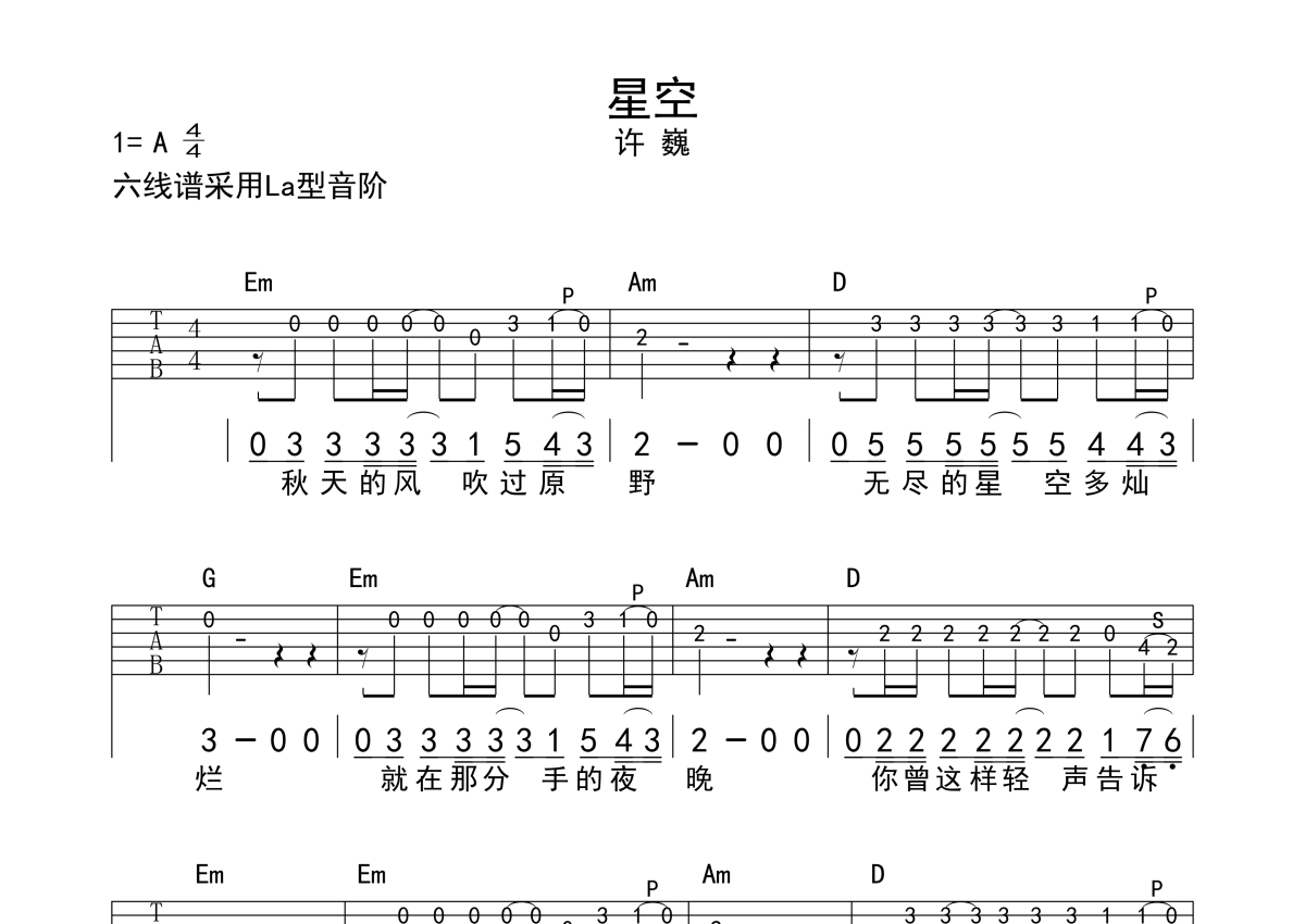 星空吉他谱 - 许巍演唱 - G调独奏solo六线谱