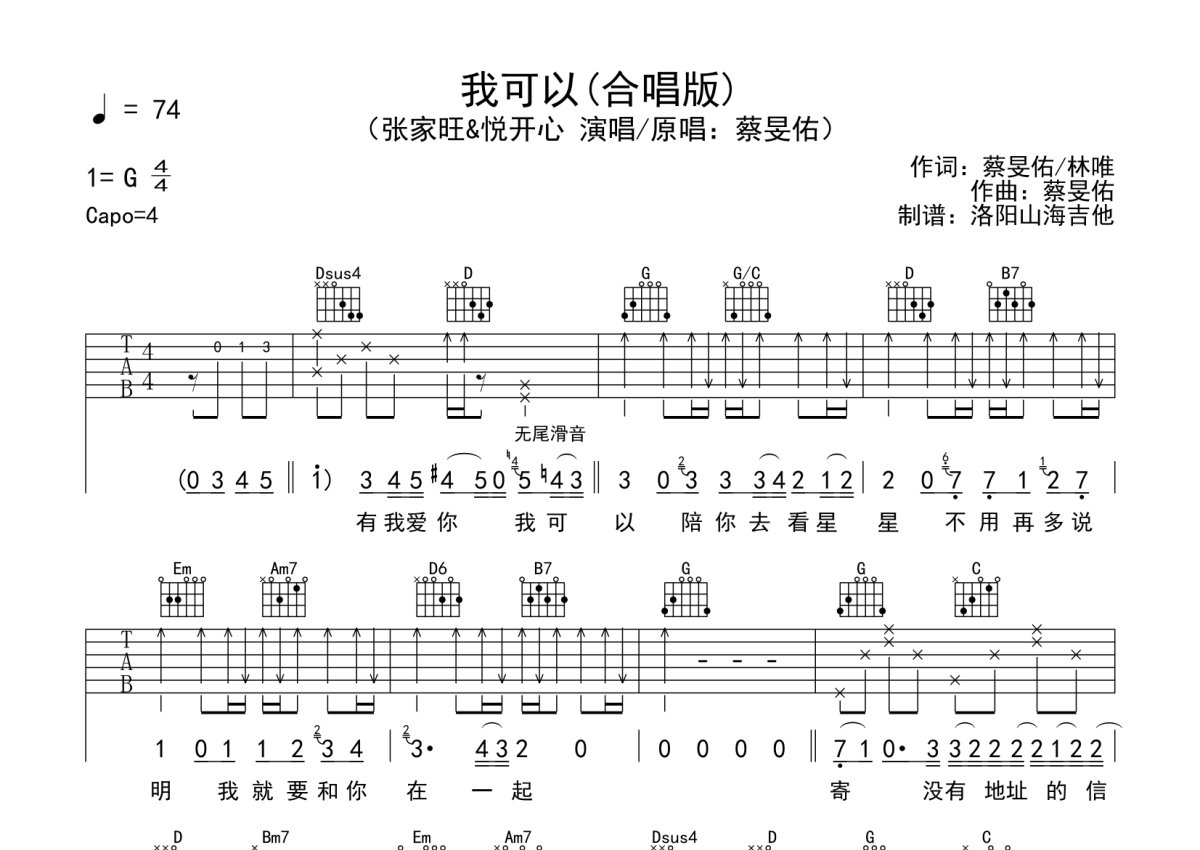 张家旺&悦开心《我可以》吉他谱 - G调弹唱六线谱